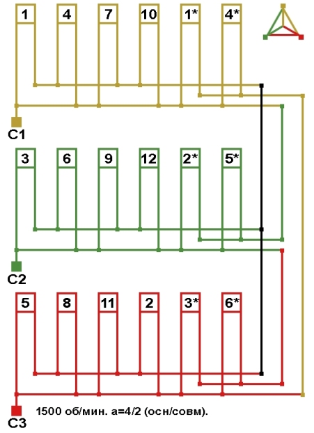 Схема соединений трехслойной совмещённой обмотки с последовательным соединением фаз, количество параллельных ветвей (основная/совмещённая): а=4/2.