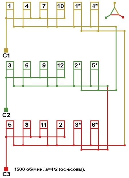 Схемы соединений электродвигателя с трехслойной совмещённой обмоткой 1500 об/мин.