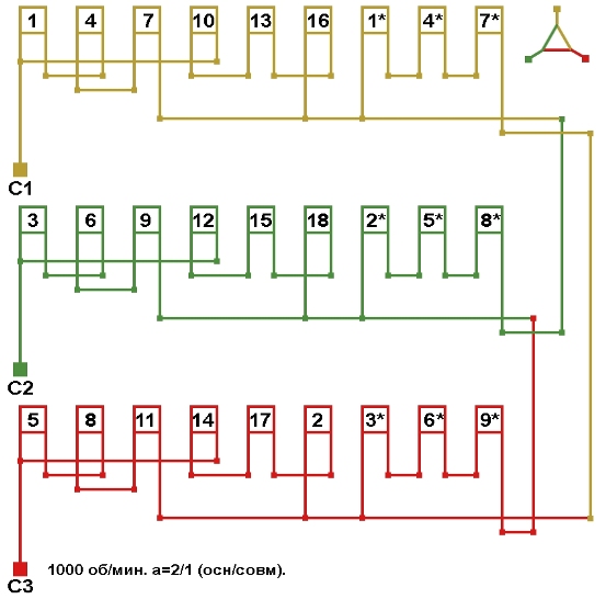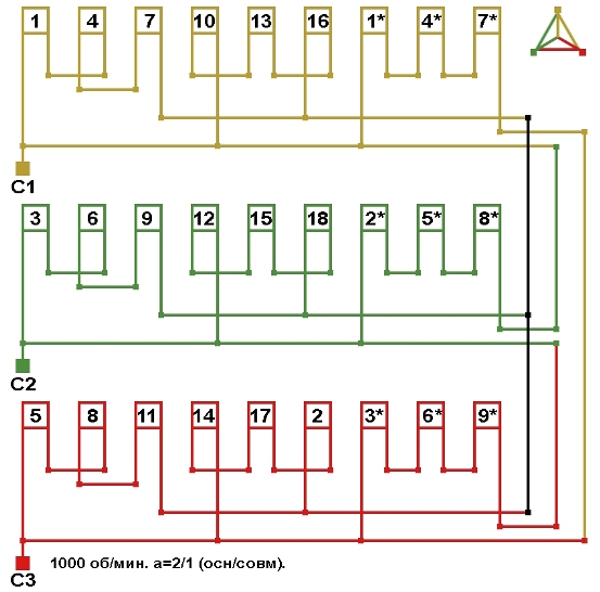 Схемы соединений электродвигателя с трехслойной совмещённой обмоткой 1000 об/мин.