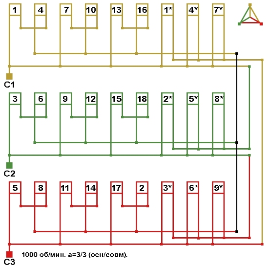 Схема соединений трехслойной совмещённой обмотки с параллельным соединением фаз, количество параллельных ветвей (основная/совмещённая): а=3/3.