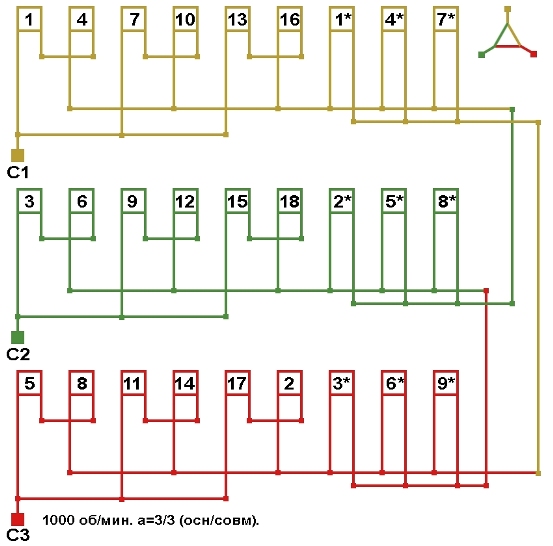Схема соединений трехслойной совмещённой обмотки с последовательным соединением фаз, количество параллельных ветвей (основная/совмещённая): а=3/3.