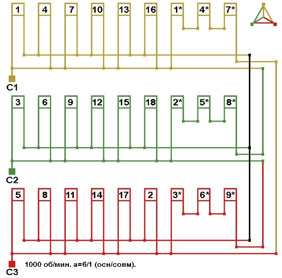 Схема соединений трехслойной совмещённой обмотки с последовательным соединением фаз, количество параллельных ветвей (основная/совмещённая): а=6/1.