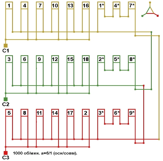 Схемы соединений электродвигателя с трехслойной совмещённой обмоткой 1000 об/мин.