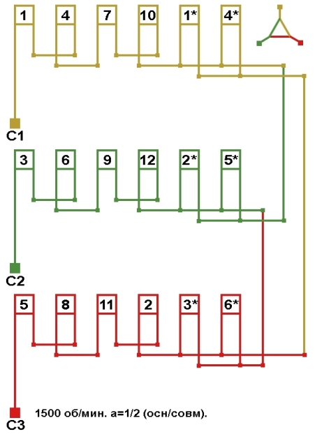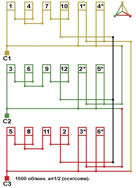 Схемы соединений электродвигателя с трехслойной совмещённой обмоткой 1500 об/мин.
