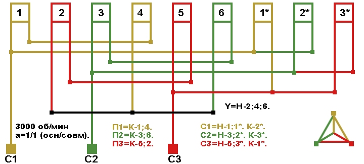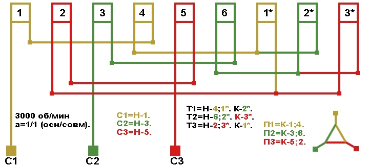 Схемы соединений электродвигателя с трехслойной совмещённой обмоткой 3000 об/мин.