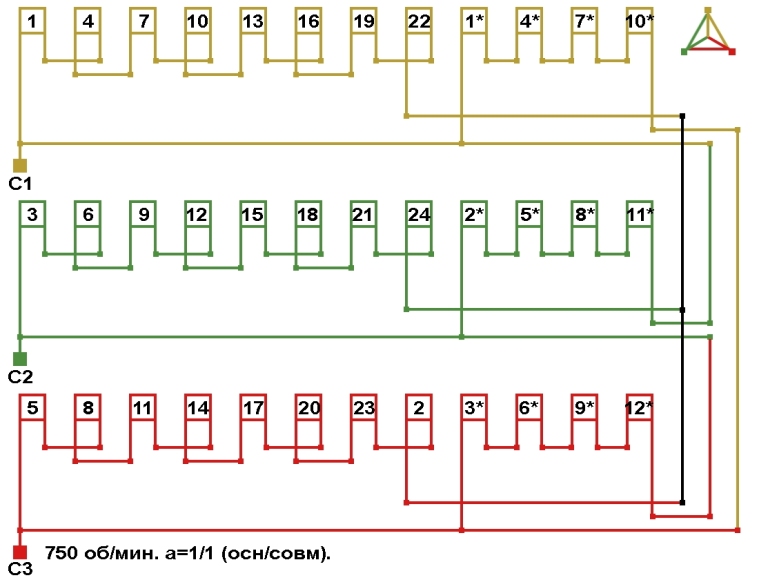 Схема соединений трехслойной совмещённой обмотки 750 об/мин, количество параллельных ветвей (основная/совмещённая): а=1/1.