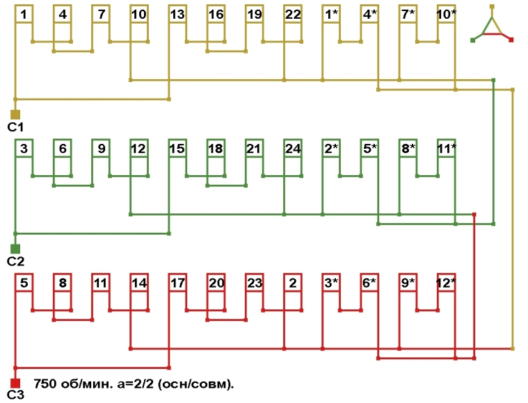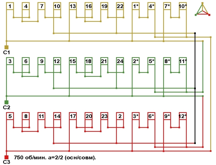 Схема соединений трехслойной совмещённой обмотки 750 об/мин, количество параллельных ветвей (основная/совмещённая): а=2/2.