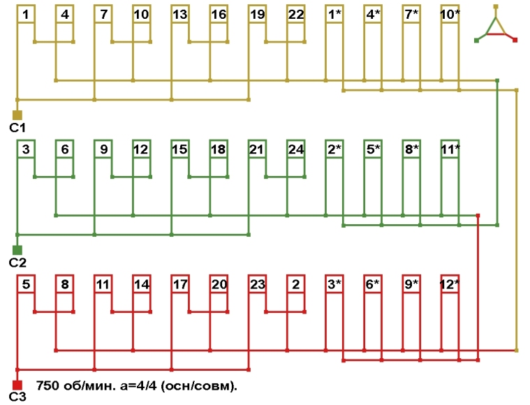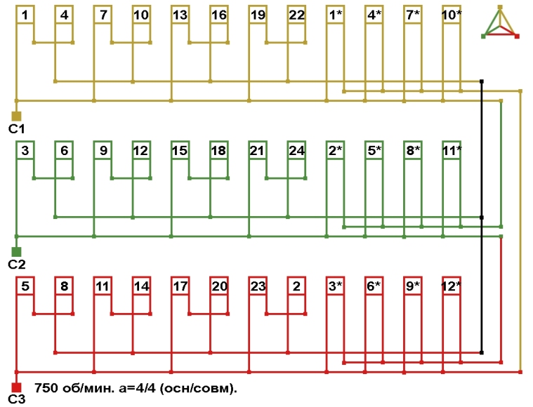 Схема соединений трехслойной совмещённой обмотки 750 об/мин, количество параллельных ветвей (основная/совмещённая): а=4/4.