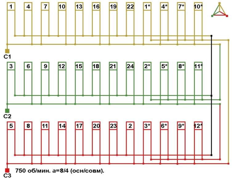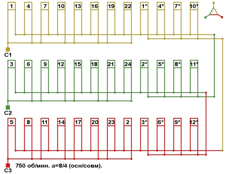 Схема соединений трехслойной совмещённой обмотки 750 об/мин, количество параллельных ветвей (основная/совмещённая): а=8/4.