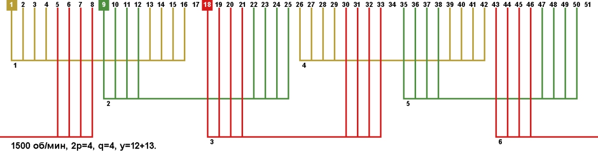 Схема укладки обмотки статора генератора DGKI75-4/K 75,0 KVA.