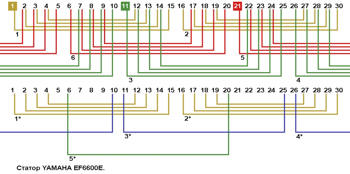 Схема соединений обмотки статора генератора Yamaha EF6600E.