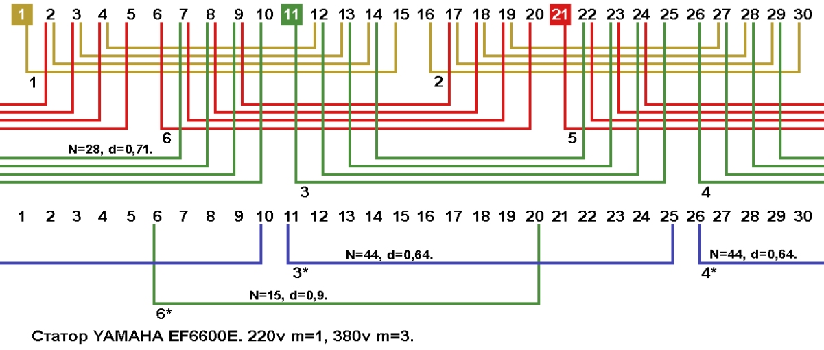 Схемы укладки и соединений обмотки статора генератора Yamaha EF6600E после пересчёта соединение на 220 вольт m=1 зигзаг или 380 вольт Y.