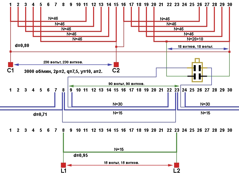 Схемы укладки и соединений обмотки статора генератора Yamaha EF6600E после пересчёта на 220 вольт m=1, с числом параллельных ветвей а=2.