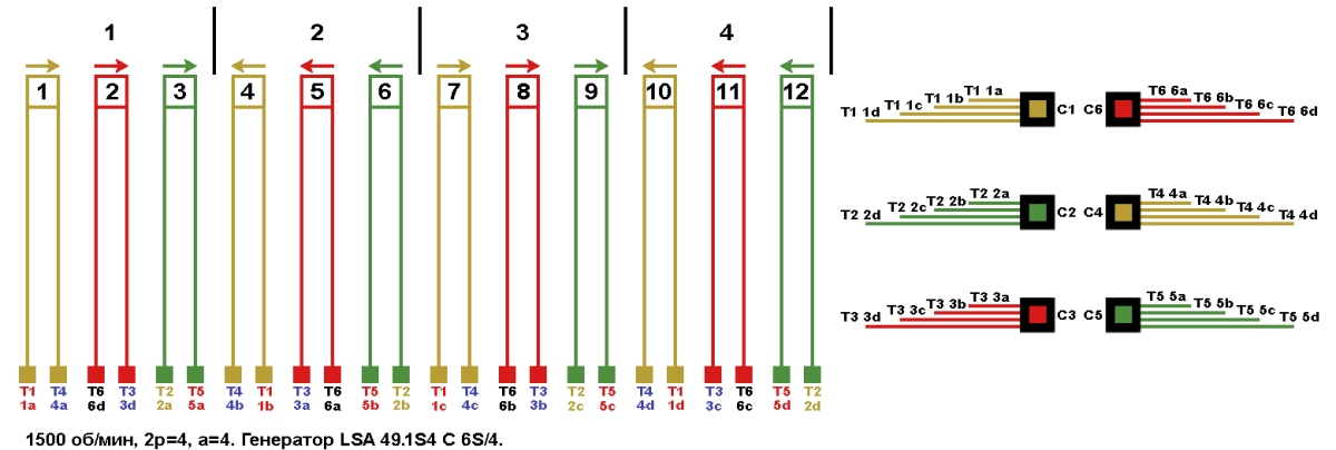 Схемы укладки и соединений обмотки статора генератора LSA 49.1S4 C 6S/4.