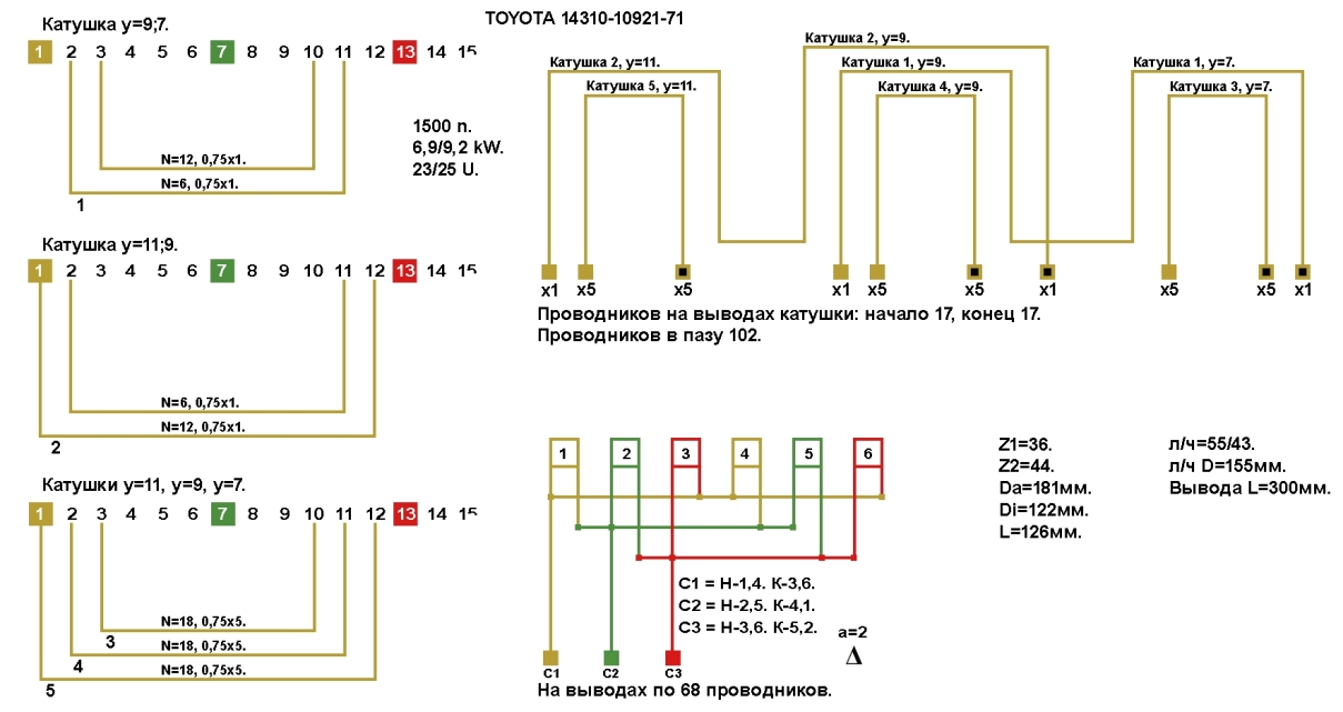 Схемы укладки и соединений обмотки статора TOYOTA 14310-10921-71.