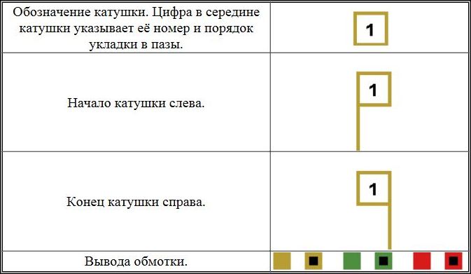 Буквенные обозначения, изображения схем и цветовая маркировка в справочнике обмотчика асинхронных электродвигателей.