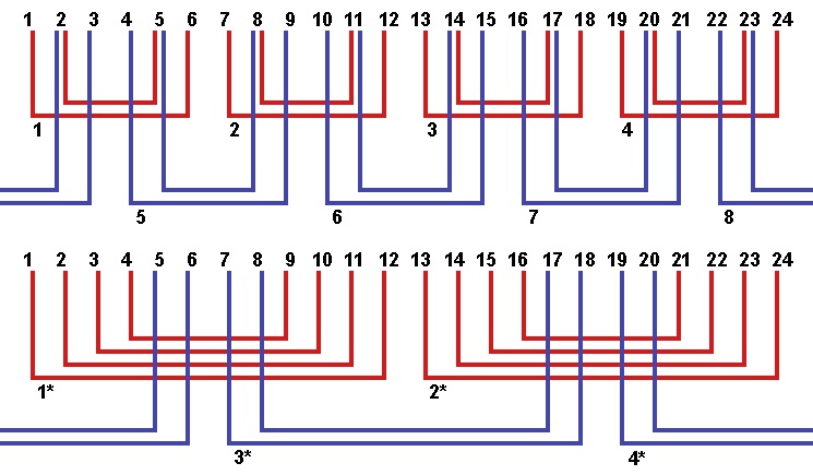 Схема укладки и соединений двухскоростной обмотки двухфазного электродвигателя Carrier.