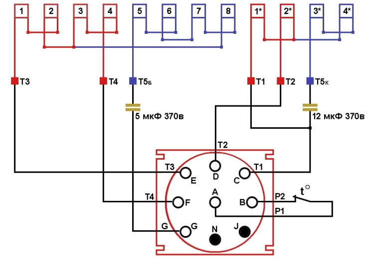 Схема соединений двухскоростной обмотки двухфазного электродвигателя Carrier.