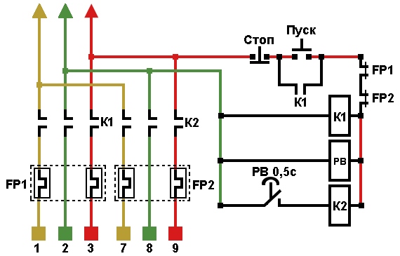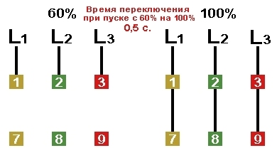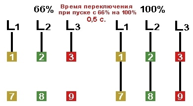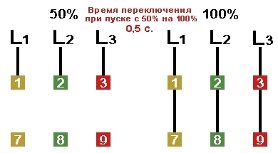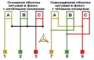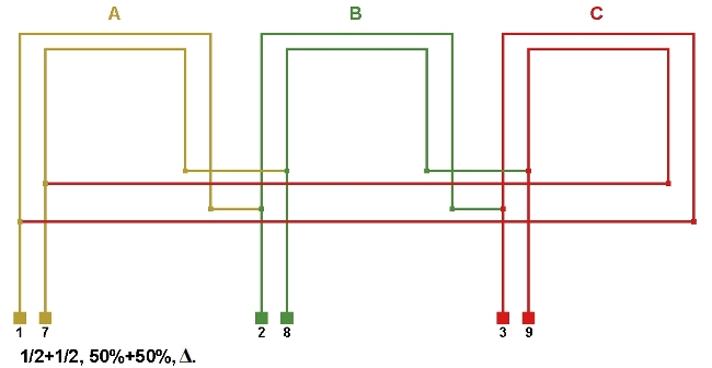 - В таких электродвигателях обмотка разделяется на две части и может иметь или не иметь внутреннее соединение. Разделение обмотки на две части может быть выполнено с помощью параллельных ветвей или параллельных проводников. Вывода обмотки 1 обозначаются цифрами 1 2 3, вывода обмотки 2 обозначаются цифрами 7 8 9. При запуске электродвигателя в первую очередь подаётся напряжение на вывода 1 2 3, а потом и на вывода 7 8 9. Время включения обмотки 2 после обмотки 1 – 0,5 с.