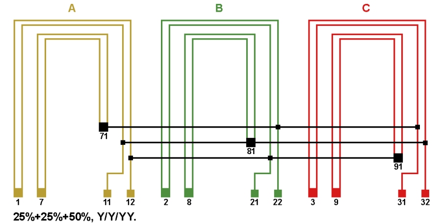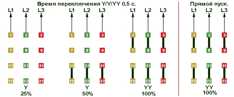 Схема подключения к сети двигателя с разделёнными обмотками 25%+25%+50%.