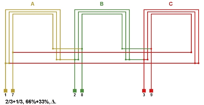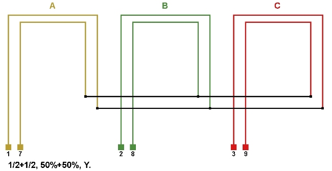 - Обмотка выполняется в четыре провода одинакового сечения. Разделение на две части происходит путём соединения двух параллельных проводников в одну обмотку и двух параллельных проводников в другую, при этом обмотки с началом фаз 1, 2 и 3 делятся на две части путём соединения каждого параллельного проводника в свою обмотку.