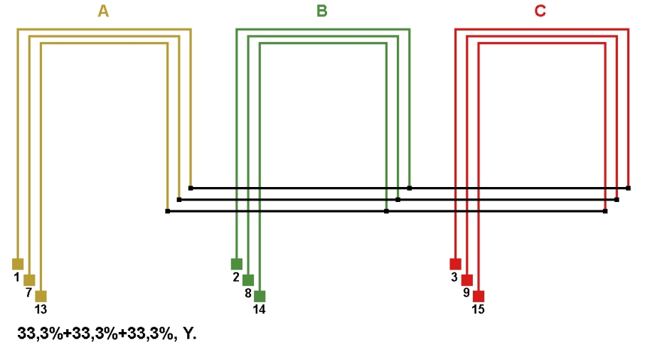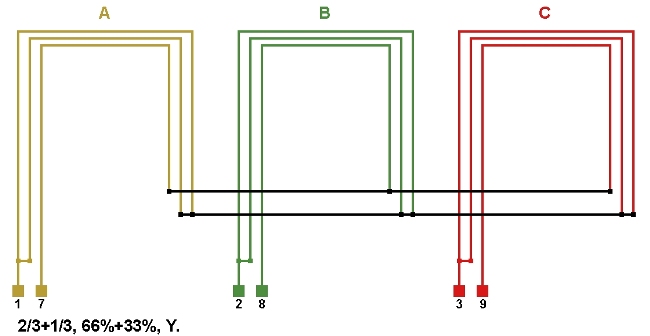 - Обмотка выполняется в пять проводов одинакового сечения. Разделение на две части происходит путём соединения трёх параллельных проводников в одну обмотку и двух параллельных проводников в другую. С помощью подбора сечения параллельных проводников, возможно выполнить значение тока по разделённым обмоткам 66%+33%.