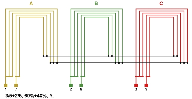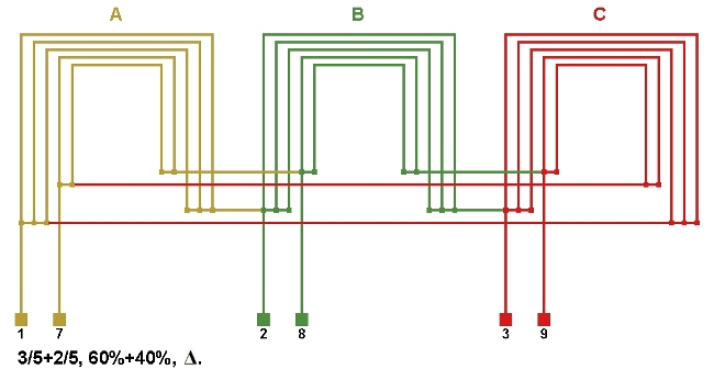 - Обмотка выполняется в три провода одинакового сечения. Разделение на две части происходит путём соединения двух параллельных проводников в одну обмотку и одного параллельного проводника в другую. С помощью подбора сечения параллельных проводников, возможно выполнить значение тока по разделённым обмоткам 60%+40%.
