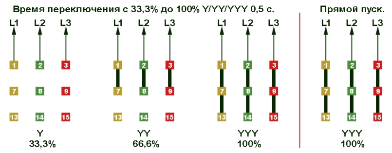 Электродвигатели с разделёнными обмотками 33,3%+33,3%+33,3%.