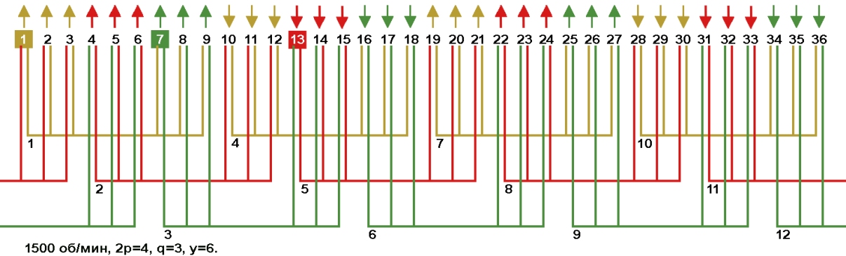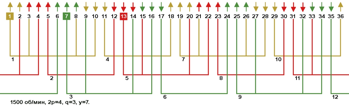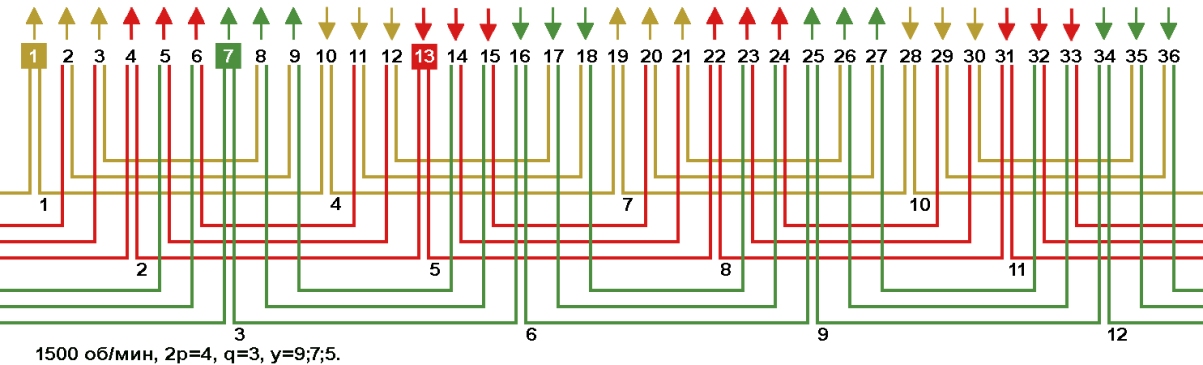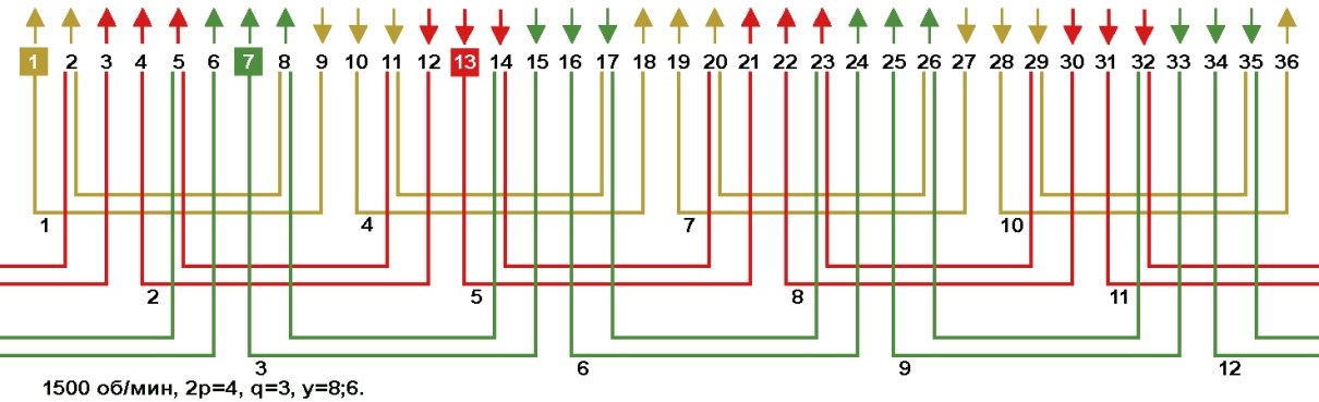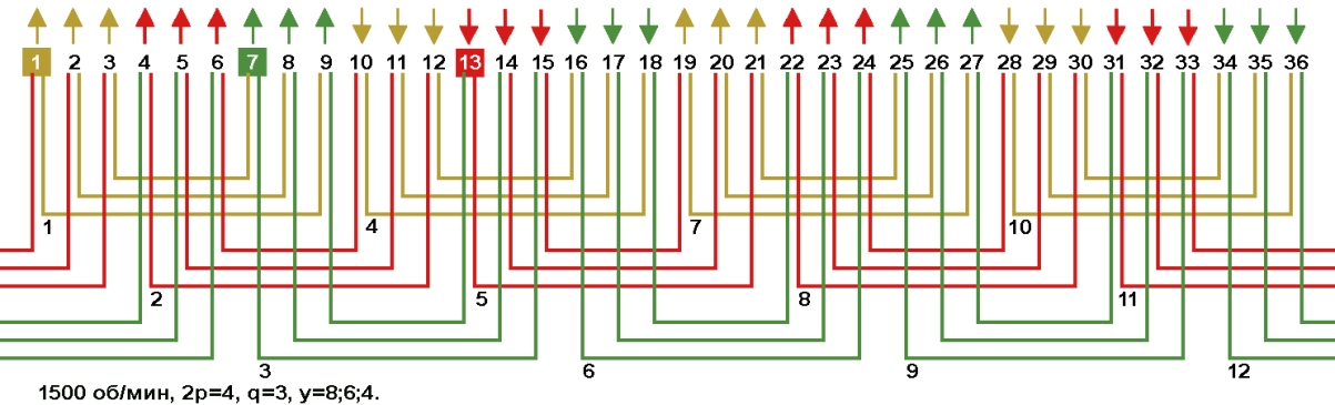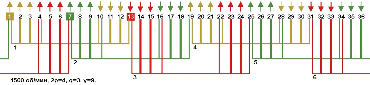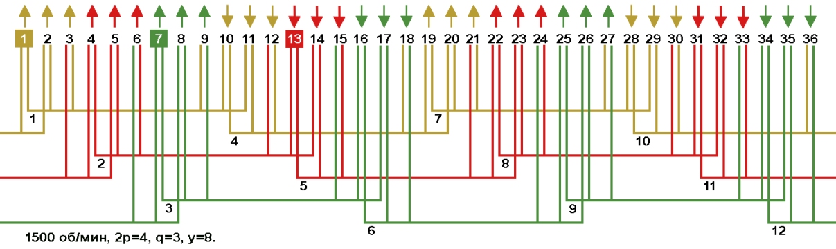 Одно-двухслойные, двухслойные и цепные обмотки с несплошной фазной зоной в электродвигателях 1500 об/мин, Z1=36.