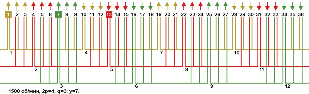 Для определения числа пазов на которое выполнено расширение фазной зоны для данной схемы, достаточно обратить внимание на фазную зону первой фазы в пазах 9, 10, 11 (катушки жёлтого цвета). Стрелки над этими пазами указывают на размер сплошной фазной зоны и составляет три паза 9, 10, 11. В пазу 8 находится правая сторона малой секции от катушки №1. Фазная зона расширилась до четырёх пазов 8, 9, 10, 11 (катушки жёлтого цвета). Точно так же определяется расширение фазной зоны и на других рисунках.