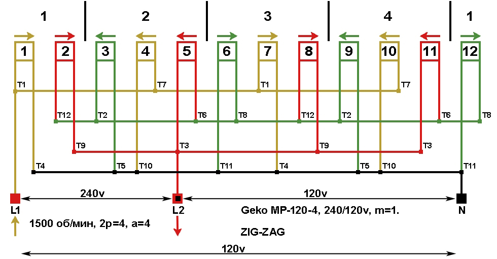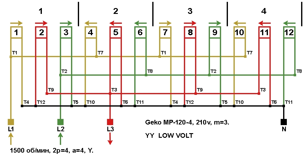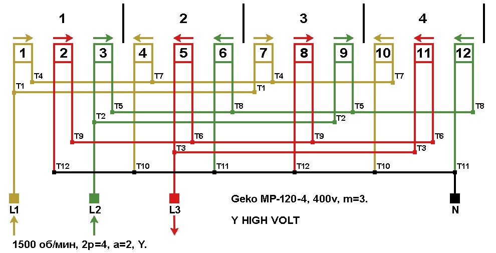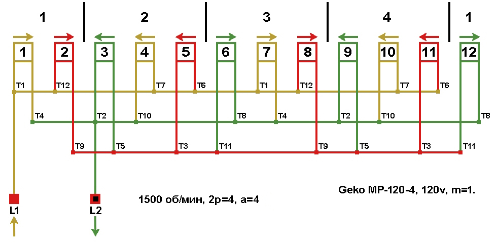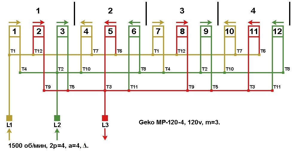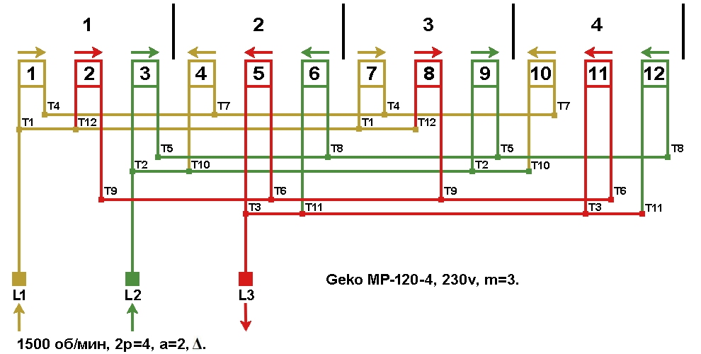 Схема укладки обмотки статора генератора Geko MP-120-4.