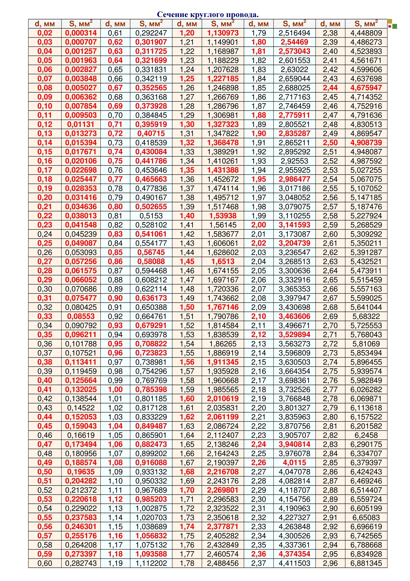 - В первом способе сама обмотка не пересчитывается, а подбирается общее сечение имеющихся в наличии параллельных проводов вместо отсутствующего провода нужного диаметра. При этом не важно во сколько параллельных проводов намотана заводская обмотка, в один, два или более провода, задача обмотчика подобрать общее сечение новых проводов равным общему сечению проводов заводской обмотки. Таблица сечений круглого провода. Заводская обмотка выполнена в два провода диаметром d=1,04, сечение провода 1,04 равно S=0,849, складываем сечения обоих проводников 0,849+0,849=1,698. В таблице сечений круглого провода находим провод с сечением S=1,698, это провод диаметром 1,47 мм., но обмоточные провода с таким диаметром не выпускаются, а рядом в таблице есть провод с диаметром 1,45 мм. Допустимое уменьшение сечения провода 3%, проверяем 1,698-3%=1,647 сечение провода 1,45 равно S=1,651 поэтому мы можем вместо двух проводов 1,04 использовать один с диаметром 1,45. Представим себе что у нас нет провода 1,45, тогда подберем нужное сечение в два или более проводов. К имеющемуся проводу с диаметром 1,12 S=0,916 найдем второй провод, 1,698-0,916=0,782, по таблице сечений круглого провода можно воспользоваться проводом с диаметром 1,00. Можно рассчитать и в три провода, общее сечение делим на три 1,698/3=0,566 получился провод 0,85. При данном расчете витки, напряжение, шаг, количество параллельных ветвей не изменяются, изменяется только диаметр провода, но общее сечение проводников остается неизменным. Расчет можно использовать для трехфазных и однофазных электродвигателей.