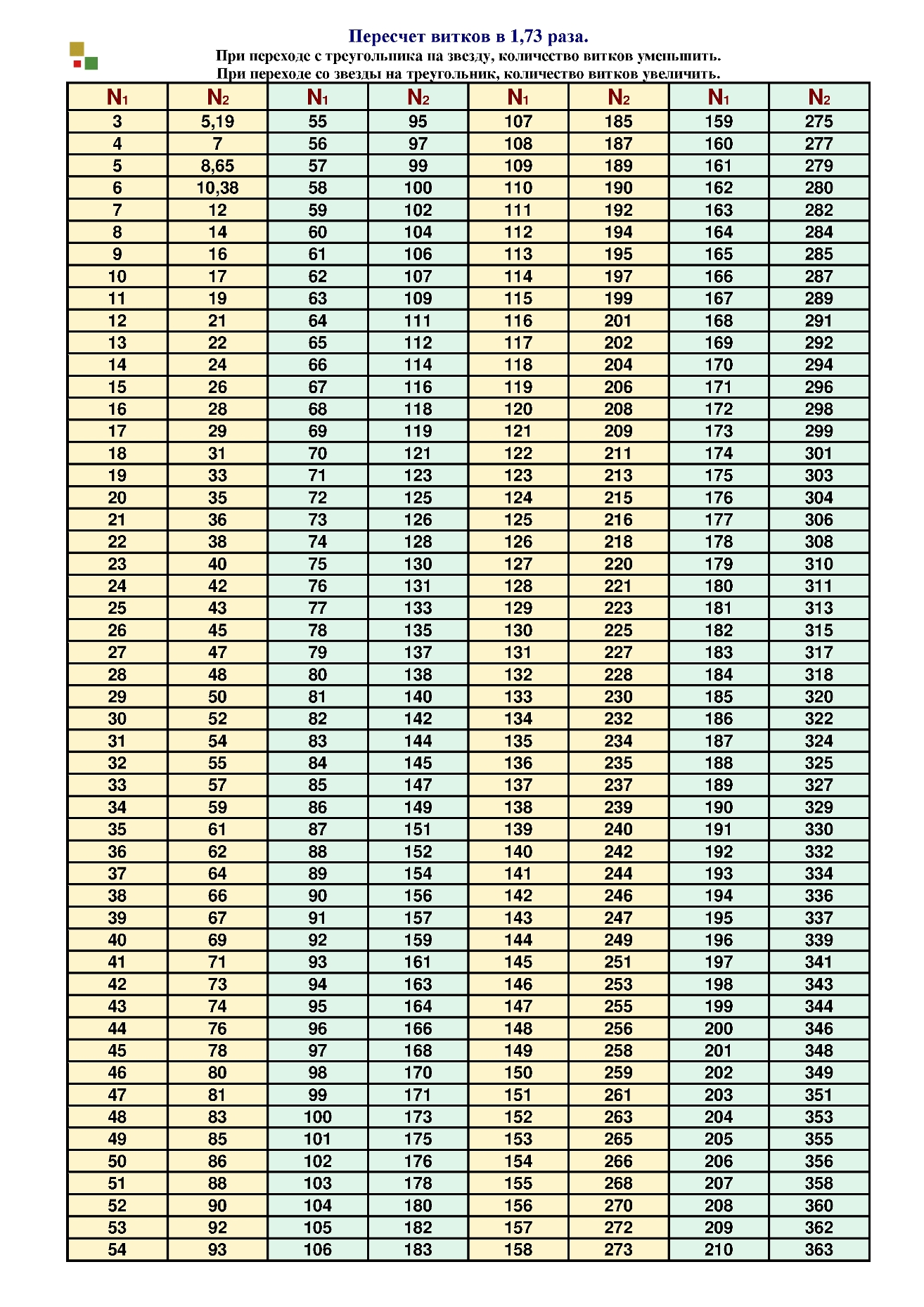 - Третий способ расчета можно использовать только для трёхфазных электродвигателей и обмотчик должен знать какое напряжение будет подаваться на вывода электродвигателя. Обмоточные данные нашего электродвигателя: напряжение 380 вольт, соединение обмотки в звезду. Мы можем пересчитать обмотку на соединение фаз в треугольник, оставив при этом напряжение питания электродвигателя 380 вольт. При пересчете обмотки со звезды на треугольник сечение провода уменьшают в 1,73 раза, а количество витков увеличивают в 1,73 раза. При пересчете обмотки с треугольника на звезду сечение провода увеличивают в 1,73 раза, а количество витков уменьшают в 1,73 раза. Так как мы пересчитываем двигатель со звезды на треугольник, то сечение провода уменьшаем в 1,73 раза S=1,698/1,73=0,981 в таблице сечений круглого провода находим провод с сечением S=0,981, подходит провод диаметром 1,12 мм. Количество витков требуется увеличить в 1,73 раза, 20×1,73=35 витков в пазу. После расчета получилась обмотка с новыми данными: витков в пазу 35, диаметр провода 1,12, соединение фаз в треугольник.