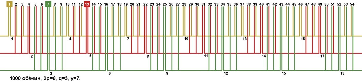- Если при всех выше перечисленных расчетах не удалось выйти на требуемый провод, расчет можно продолжить путем деления катушек обмотки на параллельные секции. Для примера возьмем обмотку двигателя 24 паза 3000 об/мин.