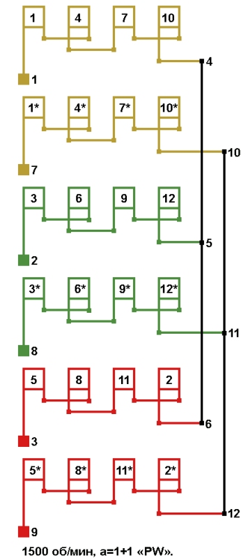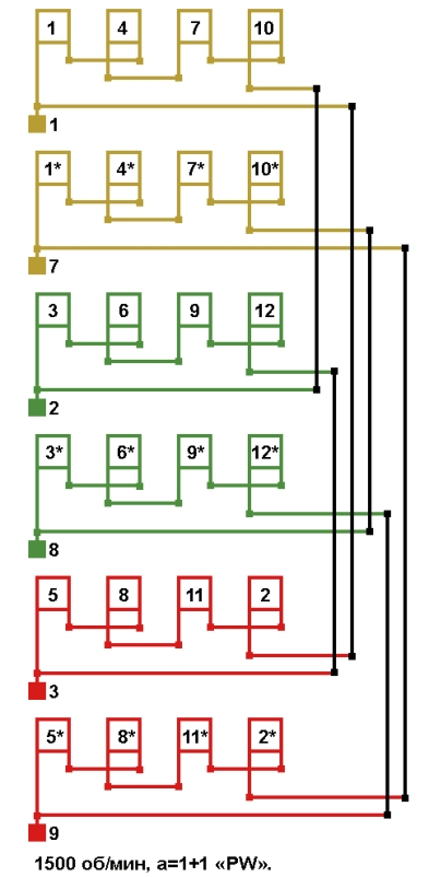 Схема соединений электродвигателей холодильного компрессора с разделёнными обмотками "PW" 1500 об/мин а=1+1, Y/YY.