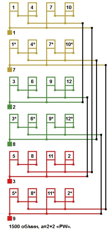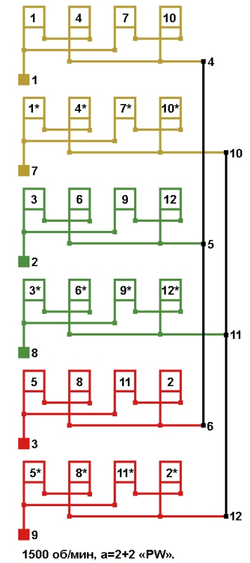 Схема соединений электродвигателей холодильного компрессора с разделёнными обмотками "PW" 1500 об/мин а=2+2, Δ/ΔΔ.