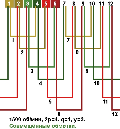 Схема укладки совмещённой обмотки в электродвигатели с количеством пазов 12, 2p=4 1500 об/мин.