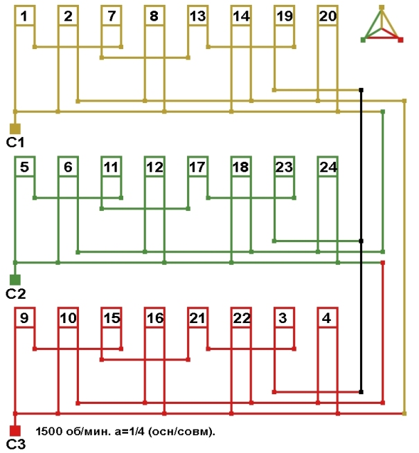 Схема соединений совмещённой обмотки с параллельным соединением фаз, количество параллельных ветвей (основная/совмещённая): а=1/4.