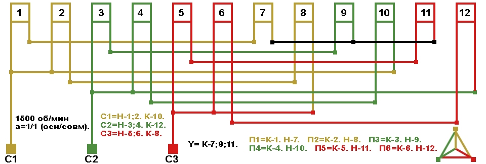 Схема соединений совмещённой обмотки с параллельным соединением фаз, количество параллельных ветвей а=1.