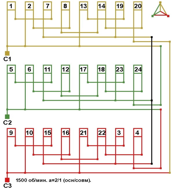 Схемы соединений электродвигателя с совмещённой обмоткой 1500 об/мин, количество параллельных ветвей (основная/совмещённая): а=2/1.