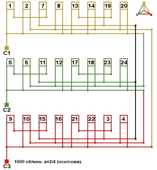 Схемы соединений электродвигателя с совмещённой обмоткой 1500 об/мин, количество параллельных ветвей (основная/совмещённая): а=2/4.
