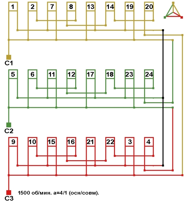 Схема соединений совмещённой обмотки с параллельным соединением фаз, количество параллельных ветвей (основная/совмещённая): а=4/1.