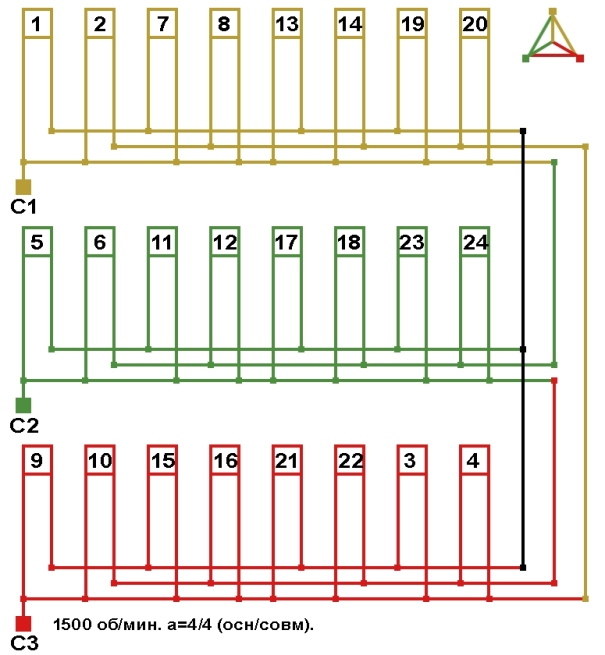 Схема соединений совмещённой обмотки с параллельным соединением фаз, количество параллельных ветвей а=4.