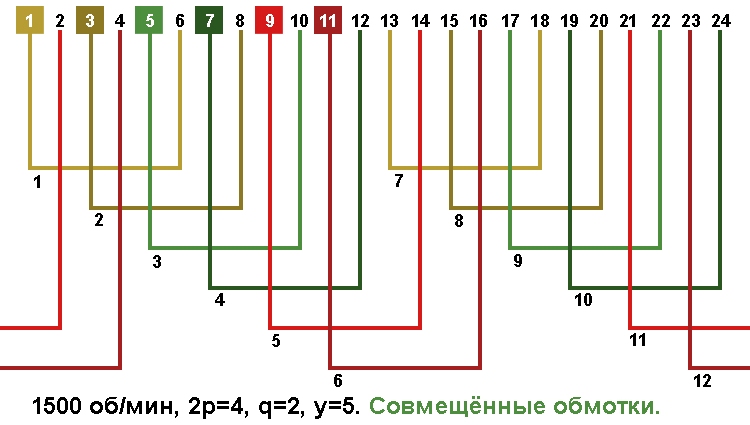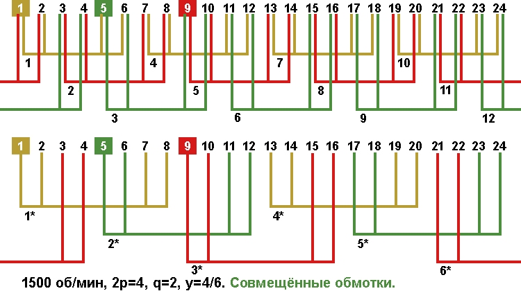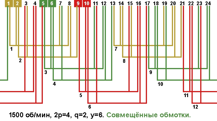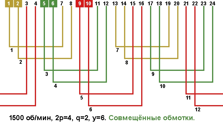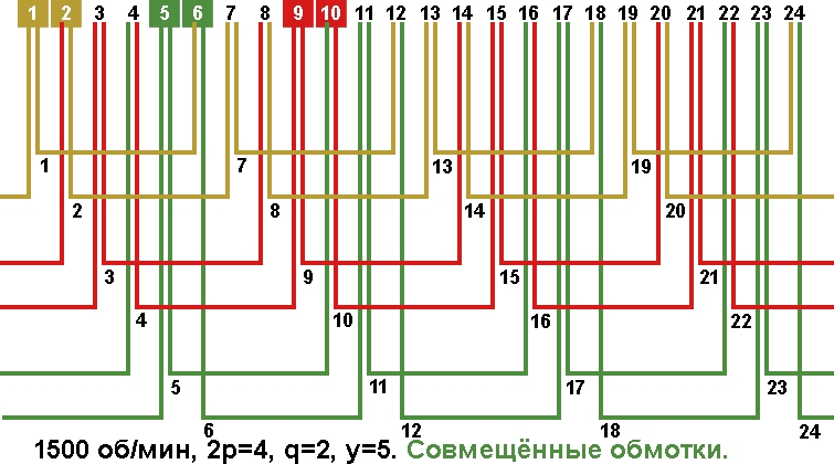 Схема укладки совмещённой обмотки в электродвигатели с количеством пазов 24, 2p=4 1500 об/мин.