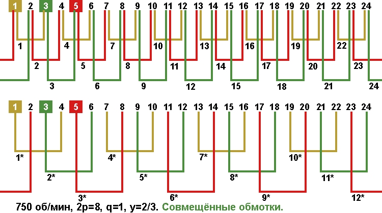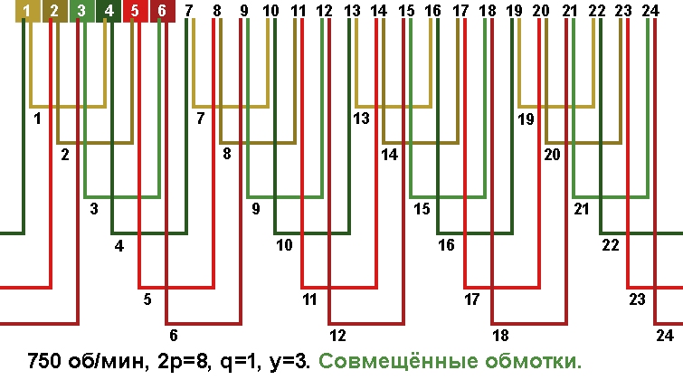 Схема укладки совмещённой обмотки в электродвигатели с количеством пазов 24, 2p=8 750 об/мин.