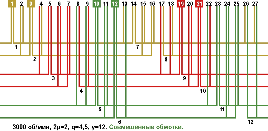 Схема укладки совмещённой обмотки в электродвигатели с количеством пазов 27, 2p=2 3000 об/мин.