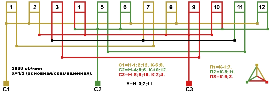 Схема соединений совмещённой обмотки с параллельным соединением фаз, количество параллельных ветвей (основная/совмещённая): а=1/2.