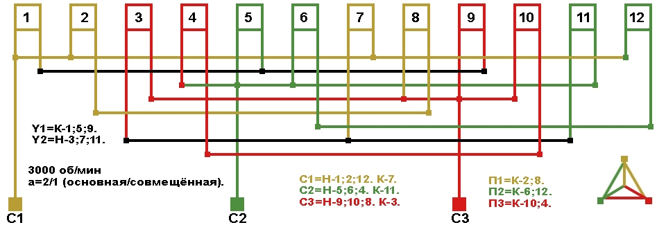 Схема соединений совмещённой обмотки с параллельным соединением фаз, количество параллельных ветвей (основная/совмещённая): а=2/1.