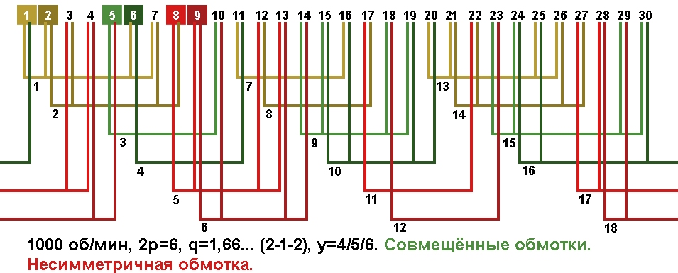Схема укладки совмещённой обмотки в электродвигатели с количеством пазов 30, 2p=6 1000 об/мин.