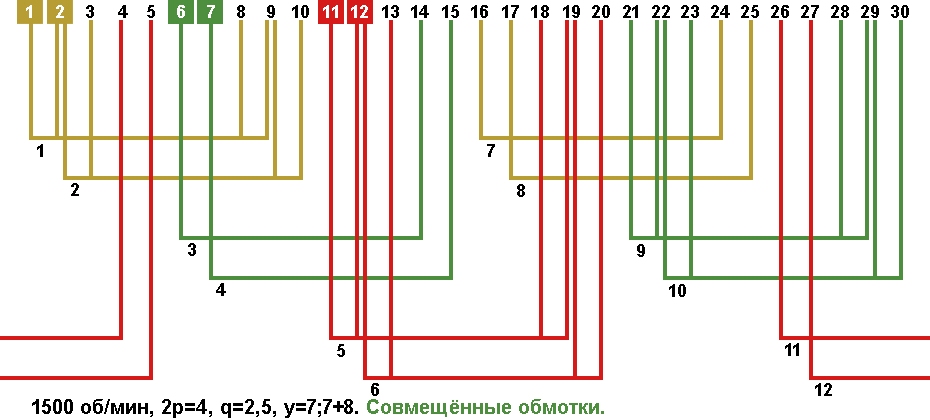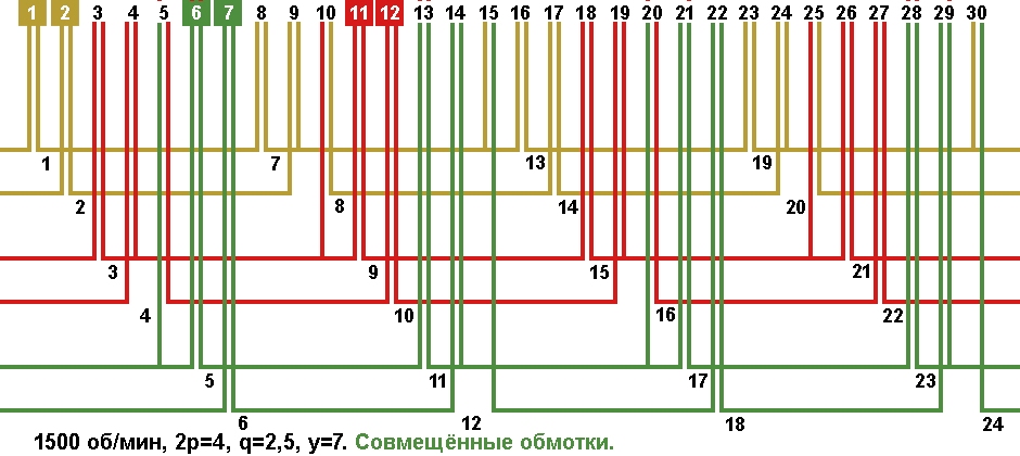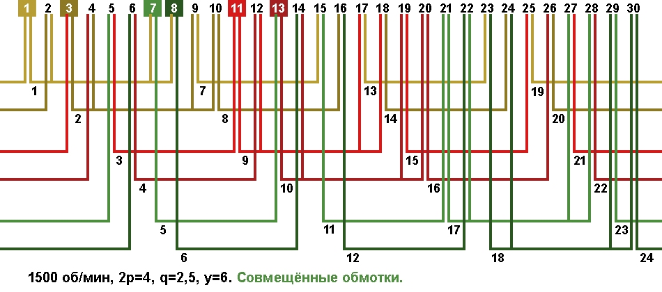 Схема укладки совмещённой обмотки в электродвигатели с количеством пазов 30, 2p=4 1500 об/мин.